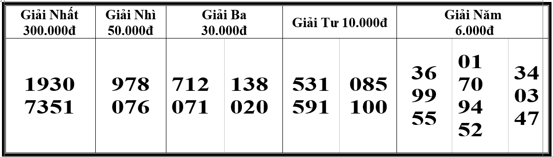| Theo biên bản mở thưởng ngày 15 tháng 01 năm 2026 Tại Công ty TNHH một thành viên Xổ số kiến thiết Hải Dương Ký hiệu M39 - Mệnh giá vé 2.000 đồng 02 GIẢI ĐẶC BIỆT TRỊ GIÁ MỖI GIẢI: 3.000.000 đồng 61286 - 29383 Giải khuyến khích (có số hàng chục và hàng đơn vị trùng với số hàng chục và hàng đơn vị của giải đặc biệt ) mỗi giải 6.000đ: 86 - 83 ![]() Vé trúng nhiều giải sẽ được lĩnh đủ giá trị các giải (không bao gồm giải đặc biệt). Chấm dứt lưu hành loại vé xổ số Bóc ký hiệu M34 vào ngày 19/3/2026. Thanh toán dứt điểm ngày 29/3/2026./. |