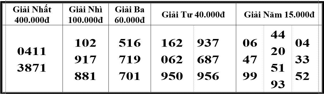 | 01 GIẢI ĐẶC BIỆT TRỊ GIÁ 6.000.000 đồng 71208 iải khuyến khích (có số hàng chục và hàng đơn vị trùng với số hàng chục và hàng đơn vị của giải đặc biệt ) mỗi giải 15.000đ: 08 ![]() - Vé trúng nhiều giải sẽ được lĩnh đủ giá trị các giải (không bao gồm giải đặc biệt). - Chấm dứt lưu hành loại vé xổ số Bóc ký hiệu B64 vào ngày 06/07/2026. Thanh toán dứt điểm ngày 16/07/2026./. |